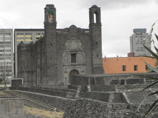 Zona Arqueológica de Tlatelolco, ao fundo, a Igreja de Santiago, construída com pedras de Tlatelolco.